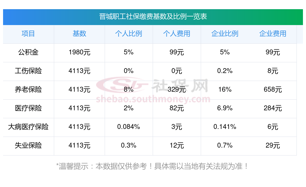 晋城缴费社保比例社保公司和个人各交多少?下表是2024-2025年晋城社保费用明细参考,新社通app-社保缴费查询工具提供的最新数据如下: