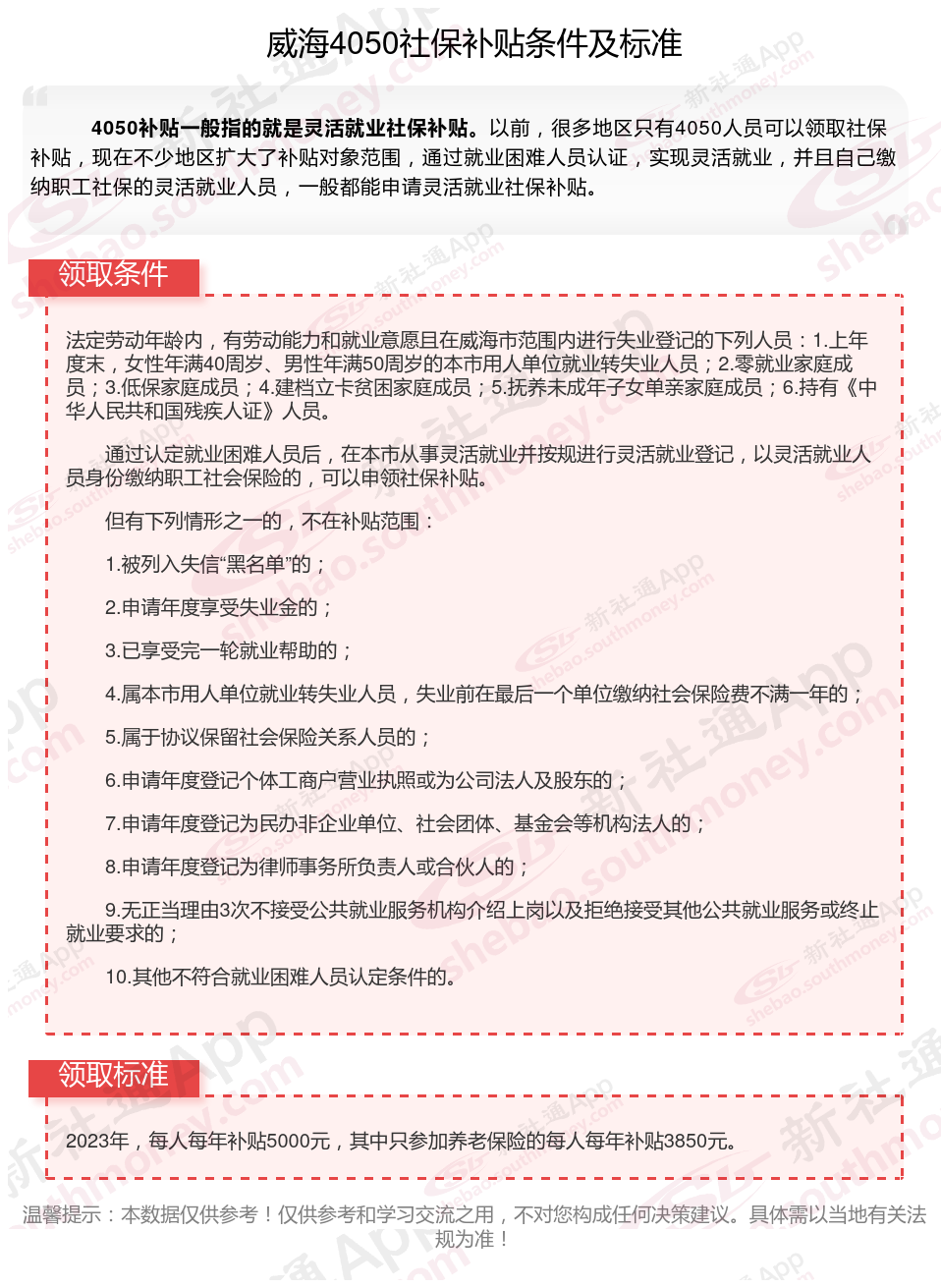 二、2025年威海4050社保补贴标准,最新领取条件来了