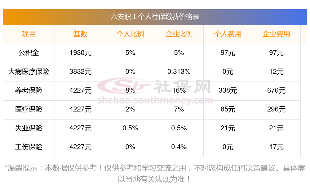 2025年六安社保缴费多少钱?下表是2024-2025年六安社保费用明细参考,新社通app-社保缴费查询工具提供的最新数据如下: