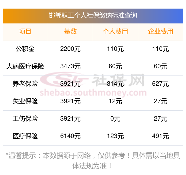 2025年邯郸社保缴费多少钱?下表是2024-2025年邯郸社保费用明细参考,新社通app-社保缴费查询工具提供的最新数据如下: