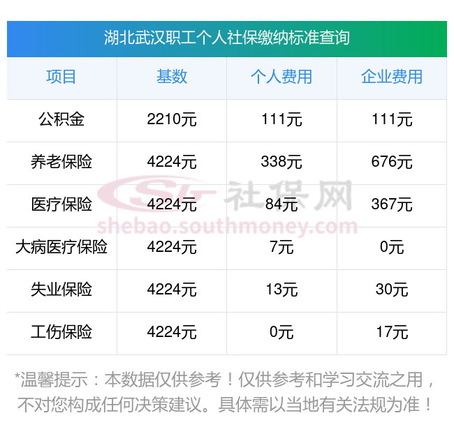 2025年湖北武汉社保缴费多少钱?下表是2024-2025年湖北武汉社保费用明细参考,新社通app-社保缴费查询工具提供的最新数据如下: