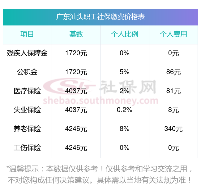 广东汕头社保缴费比例和基数2025年来了广东汕头社保缴费最新调整一览表,新社通app-社保缴费查询工具提供的最新数据如下: