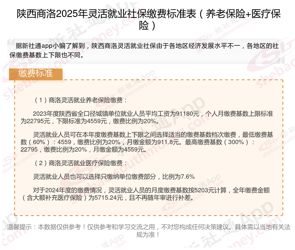 据新社通app数据显示,陕西商洛灵活就业养老保险缴费基数2024-2025年最新标准如下: