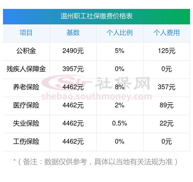 2025年温州社保缴费多少钱?下表是2024-2025年温州社保费用明细参考,新社通app-社保缴费查询工具提供的最新数据如下: