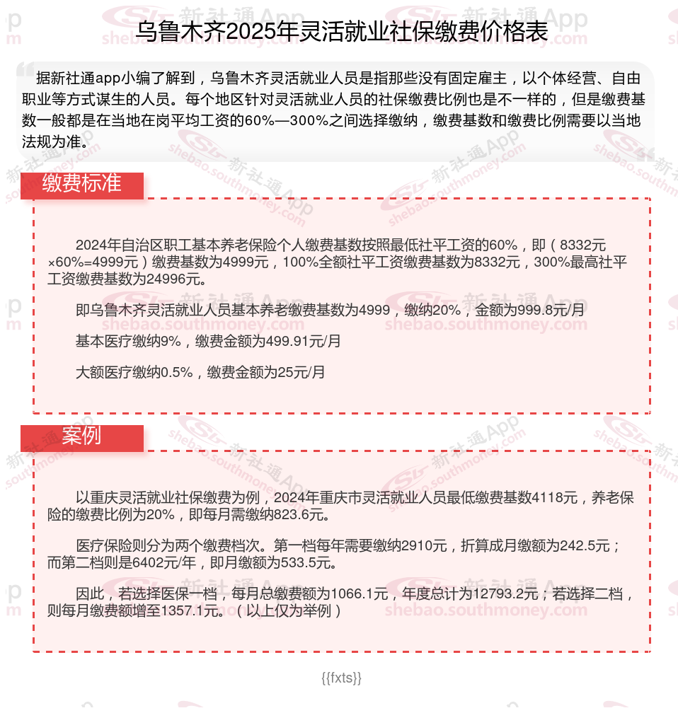 随着经济社会的不断发展,灵活就业群体日益壮大,其社保缴费问题也愈发受到关注。接下来随社保君了解一下2025年乌鲁木齐灵活就业人员社保交多少钱的详细内容。