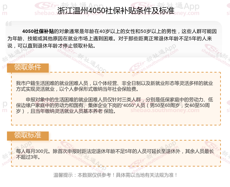 二、2025年浙江温州4050社保补贴标准及条件,最新如下: