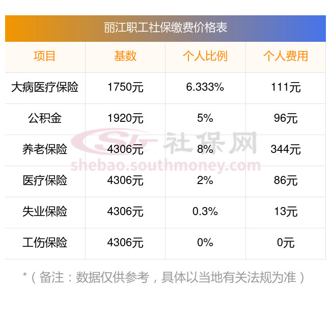 2025年丽江社保缴费多少钱?下表是2024-2025年丽江社保费用明细参考,新社通app-社保缴费查询工具提供的最新数据如下: