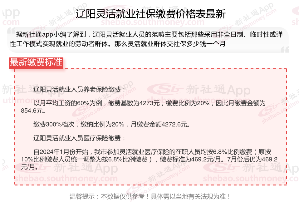 辽阳灵活就业自己交社保一个月要交多少钱?辽阳灵活就业人员社会保险缴费标准,根据新社通app-社保缴费查询工具提供的最新数据如下: