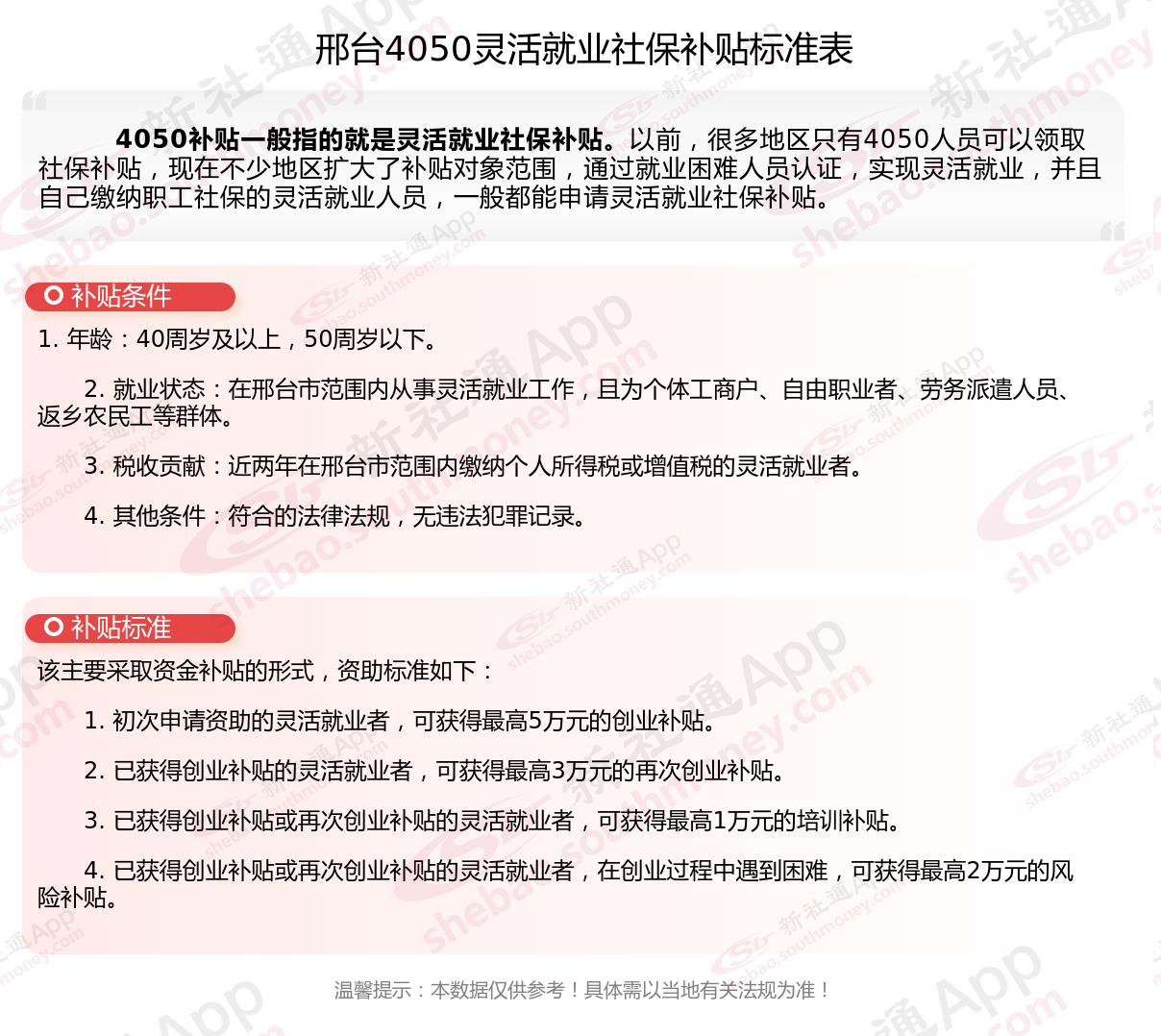二、2025年邢台4050社保补贴标准及条件,最新如下: