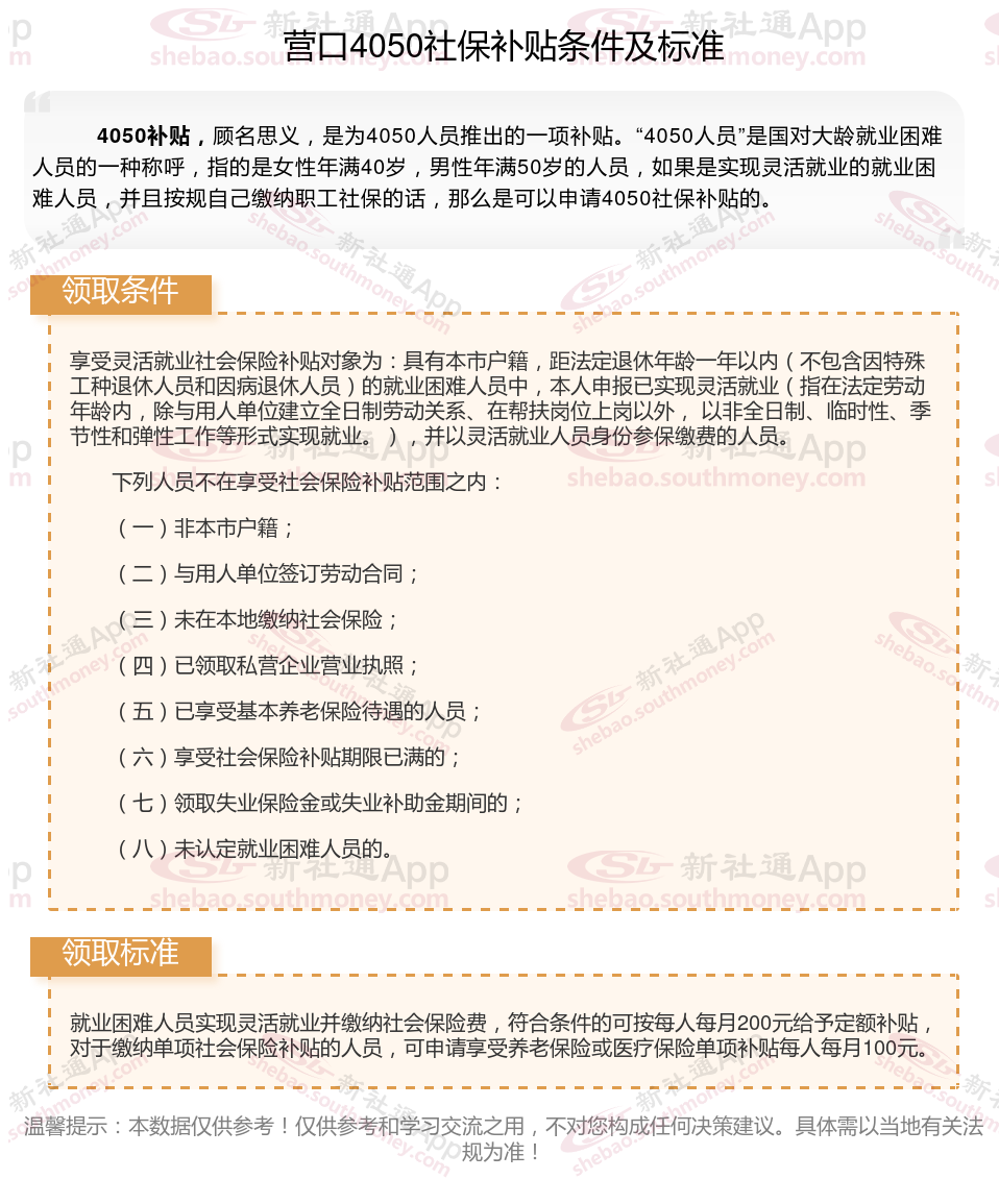 今天聊一下4050补贴的相关内容。4050补贴听起来像是一个针对特定年龄人群的社保补贴。比如女性需年满40周岁,男性需年满50周岁(以申请当年12月31日为截止日期)。那么营口4050灵活就业困难人员社保补贴多少钱?营口4050社保补贴可以申请吗?接下来随新社通APP小编具体了解一下4050社保补贴内容。