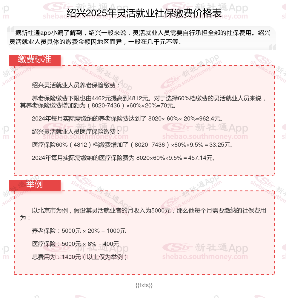灵活就业社保缴费标准每年都会有所调整,主要体现在缴费基数和缴费比例上。接下来随社保君了解一下2025年绍兴灵活就业人员社保缴费标准是怎样的的相关内容。