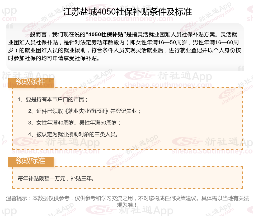 二、2025年江苏盐城4050社保补贴标准及条件,最新如下: