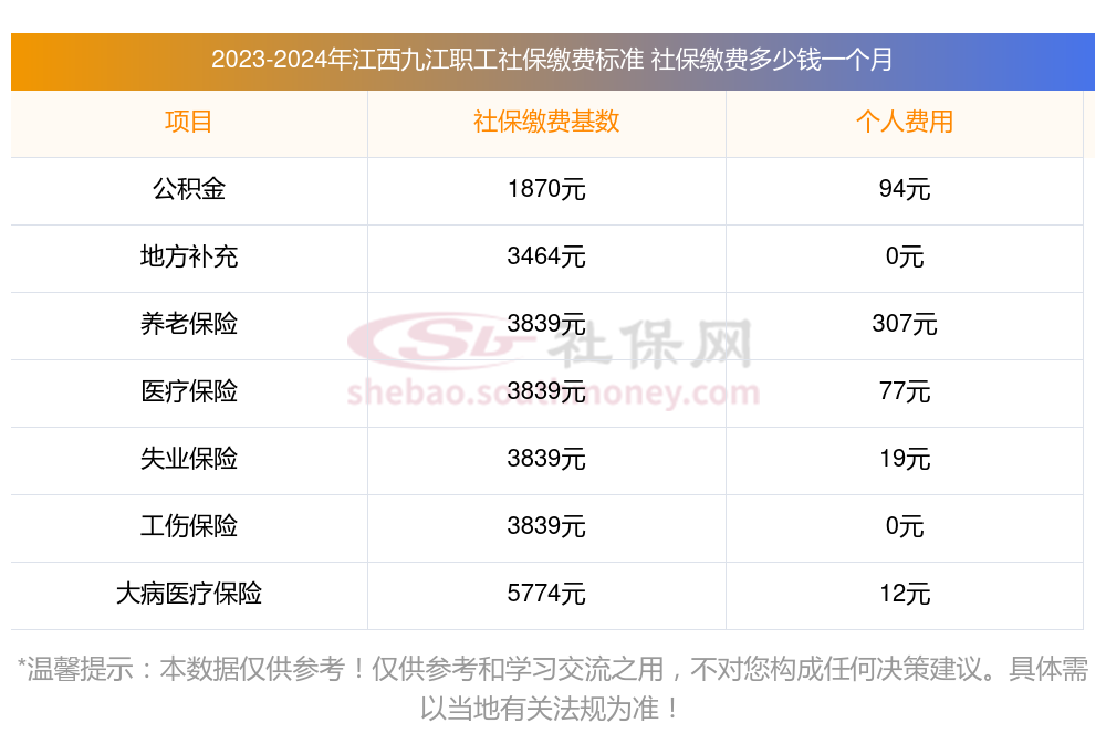 (江西九江社保最低一个月要交多少钱)江西九江社保费用明细最新如下: