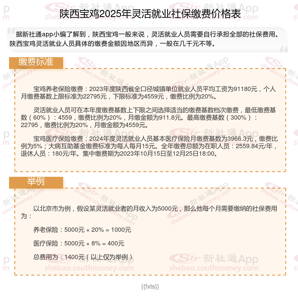 那么,陕西宝鸡灵活就业人员社保缴费基数最新标准,灵活就业人员自己交社保一个月得交多少钱?根据新社通app-社保缴费查询工具提供的2025社保缴费标准详情数据: