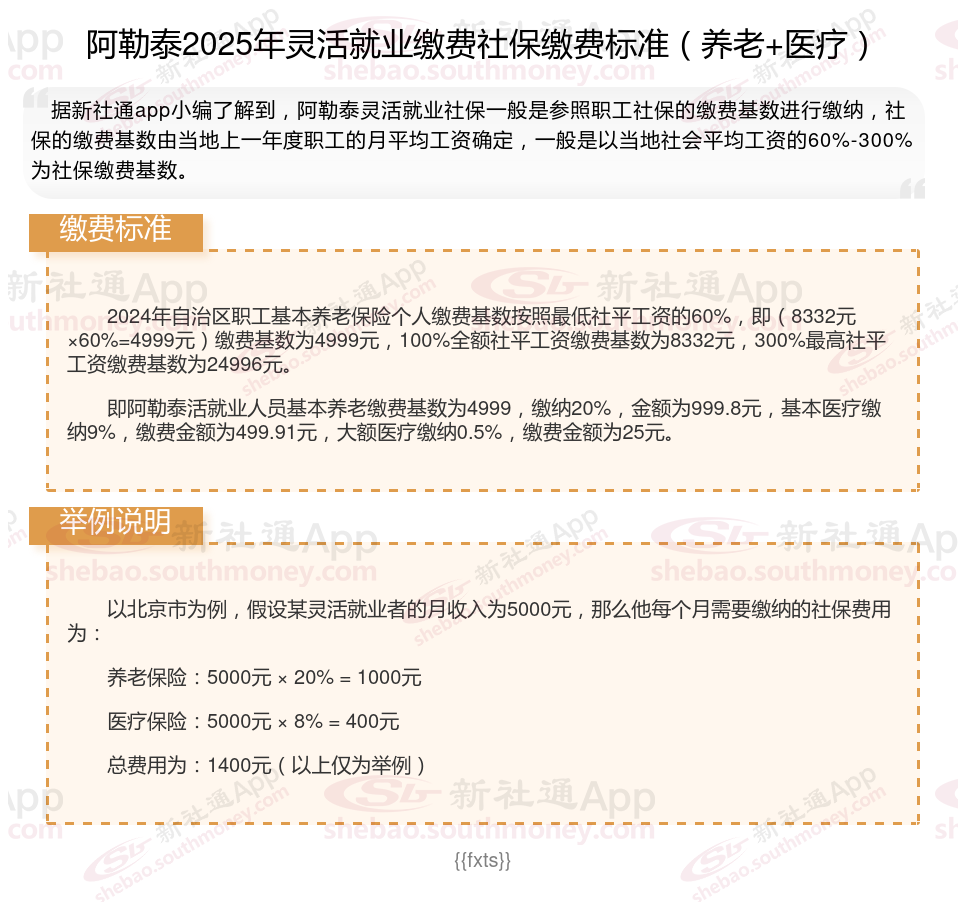 2025年阿勒泰灵活就业人员社保交多少钱,你了解2025年阿勒泰灵活就业人员社保缴费基数及比例吗,据新社通小编了解到,灵活就业社保缴费标准每年都会有所调整,主要体现在缴费基数和缴费比例上。接下来随新社通APP小编一起来看看。