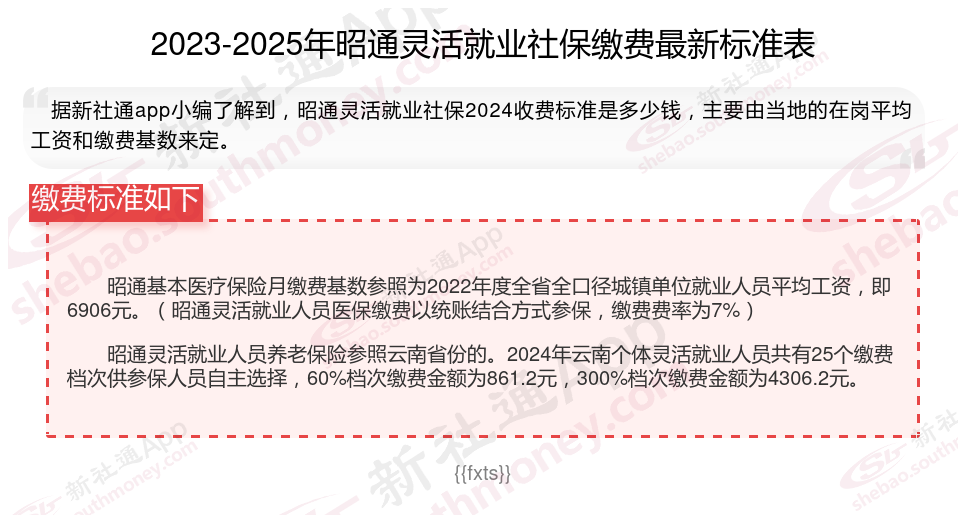 2025年昭通城镇职工社会保险缴费基数用人单位及其职工(包括有雇工的个体工商户及其雇工)分别按2024年度全口径省平的60%(4306.2元/月)和300%(21531元/月)核定缴费基数的下限和上限执行。