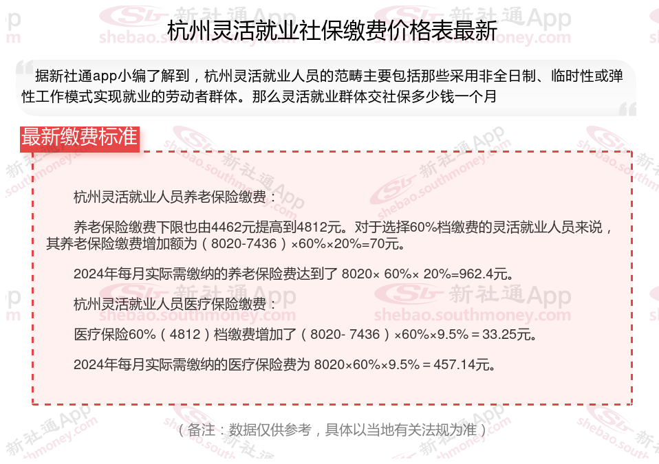 杭州灵活就业社保缴费标准,杭州社保缴费多少钱?下表是2024-2025年杭州社保费用明细参考,根据新社通app-社保缴费查询工具提供的最新数据如下: