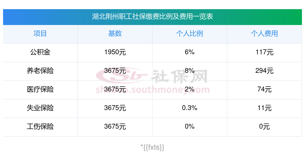 湖北荆州缴费社保比例一览 社保公司和个人各交多少?下表是2024-2025年湖北荆州社保费用明细参考,新社通app-社保缴费查询工具提供的最新数据如下: