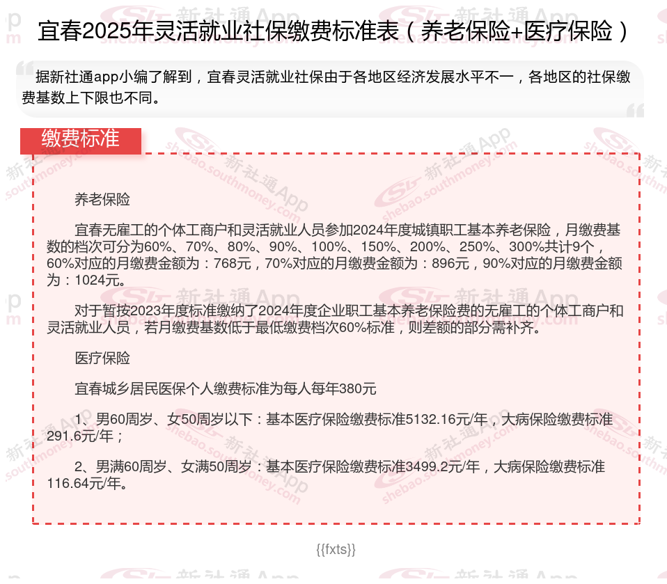 一、2025年宜春灵活就业社保缴费标准表是多少?具体如下: