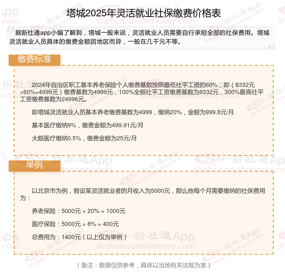 即塔城灵活就业人员基本养老缴费基数为4999,缴纳20%,金额为999.8元/月
