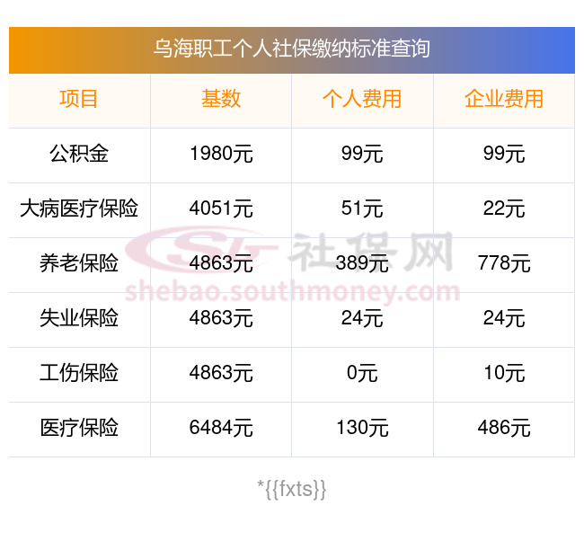 据新社通app显示,乌海企业职工社保缴费基数为:3579.00元,乌海职工社保费用详情如下: