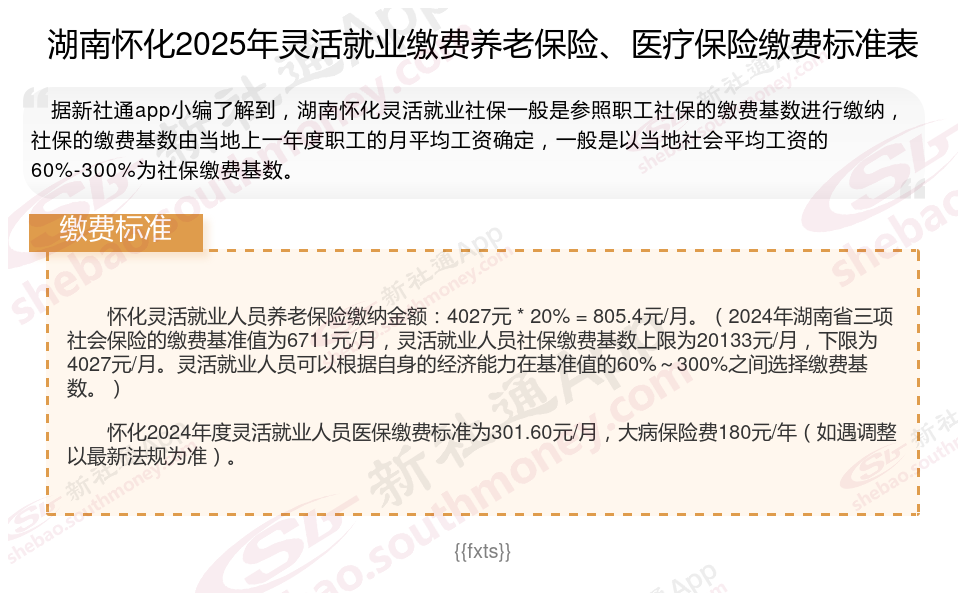 那么,自由职业者社保是多少钱一个月 湖南怀化灵活社保交多少钱?根据新社通app-社保缴费查询工具提供的2025社保缴费标准详情数据: