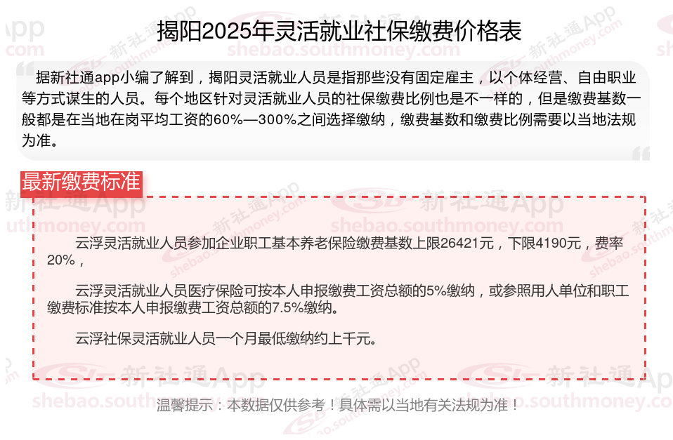 据新社通app数据显示,揭阳灵活就业养老保险缴费基数2024-2025年最新标准如下: