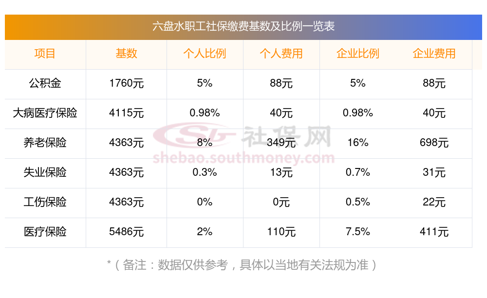 六盘水缴费社保比例一览 社保公司和个人各交多少?下表是2024-2025年六盘水社保费用明细参考,新社通app-社保缴费查询工具提供的最新数据如下: