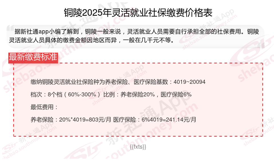 铜陵灵活就业人员社保缴费标准来了 铜陵灵活就业人员缴费多少钱怎么查?根据新社通app-社保缴费查询工具提供的2025社保缴费标准详情数据如下: