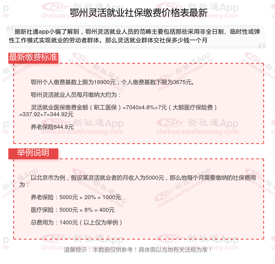 据新社通app数据显示,鄂州灵活就业人员养老缴费基数2024-2025年最新标准如下: