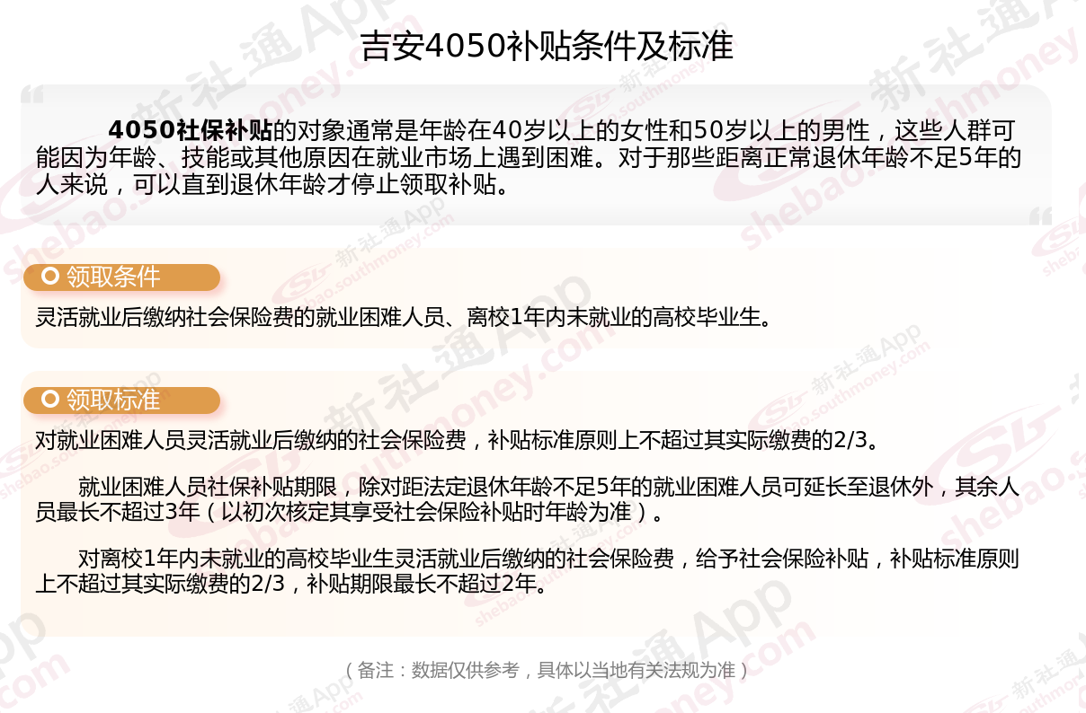 二、2025年吉安4050社保补贴标准是多少?条件是什么?