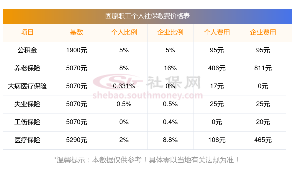 固原缴费社保比例一览 社保公司和个人各交多少?下表是2024-2025年固原社保费用明细参考,新社通app-社保缴费查询工具提供的最新数据如下: