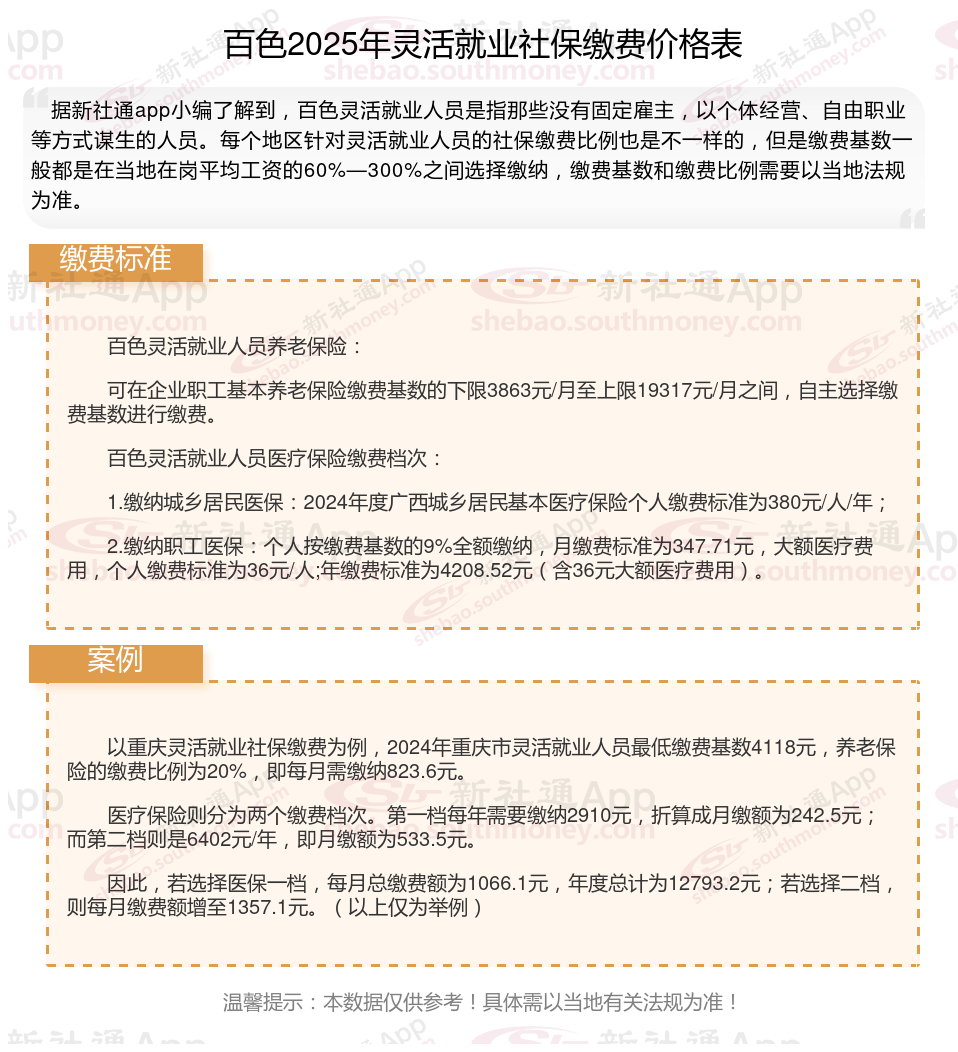 2025年百色灵活就业人员社保需要交多少钱?社保缴费的金额取决于多个因素,包括缴费基数和缴费比例,且各地标准存在差异。下面随新社通小编一起来看看。