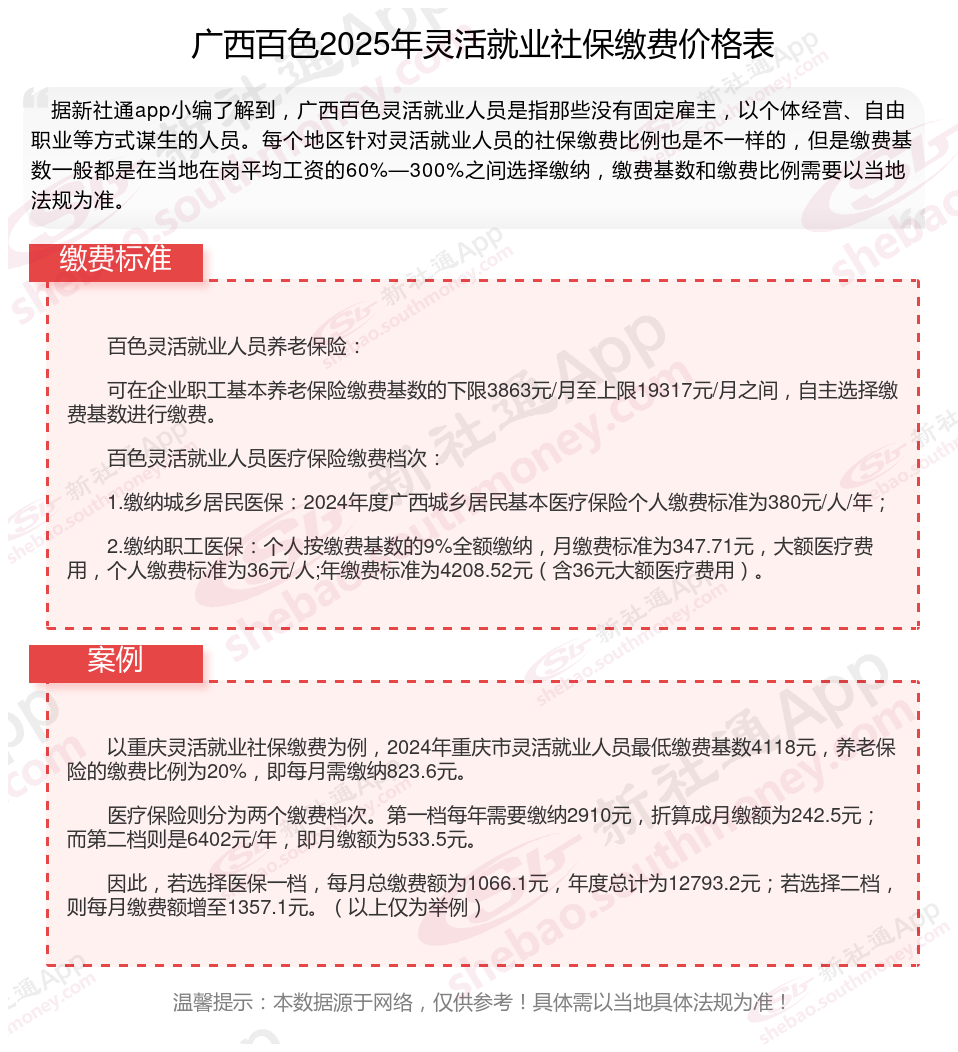 2025年广西百色灵活就业人员社保需要交多少钱?灵活就业,作为一种非传统的就业方式,近年来蓬勃发展。为保护这部分人群的权益,国制定了相应的社保缴费法规。2024年,灵活就业社保缴费法规继续完善,涵盖了养老保险、医疗保险、失业保险等多个方面,旨在为灵活就业人员提供全面的社会保证。接下来随新社通APP小编一起来看看。