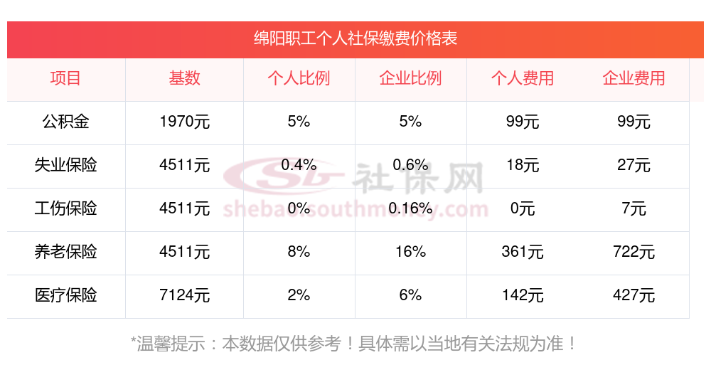 绵阳缴费社保比例一览 社保公司和个人各交多少?下表是2024-2025年绵阳社保费用明细参考,新社通app-社保缴费查询工具提供的最新数据如下: