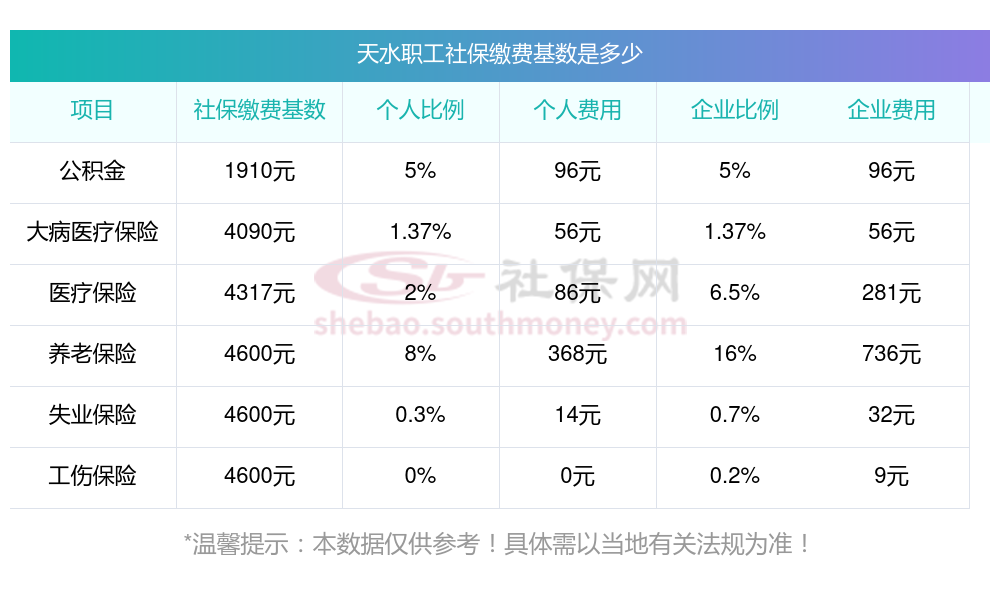 个人社保多少钱一个月??据新社通app获悉:天水企业职工社保缴费基数为:3579.00元