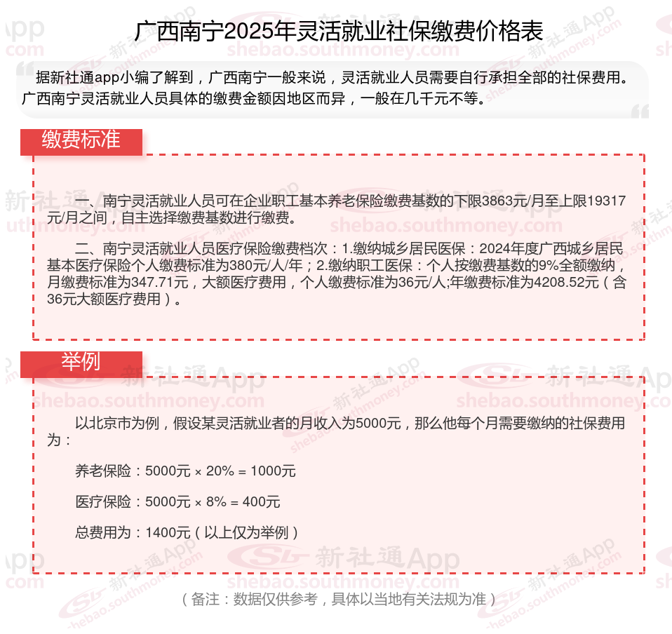 以上就是广西南宁灵活就业社保缴费的全部内容,数据及内容供参考!希望对你有帮助,欢迎关注新社通app解锁更多社保专业资讯。