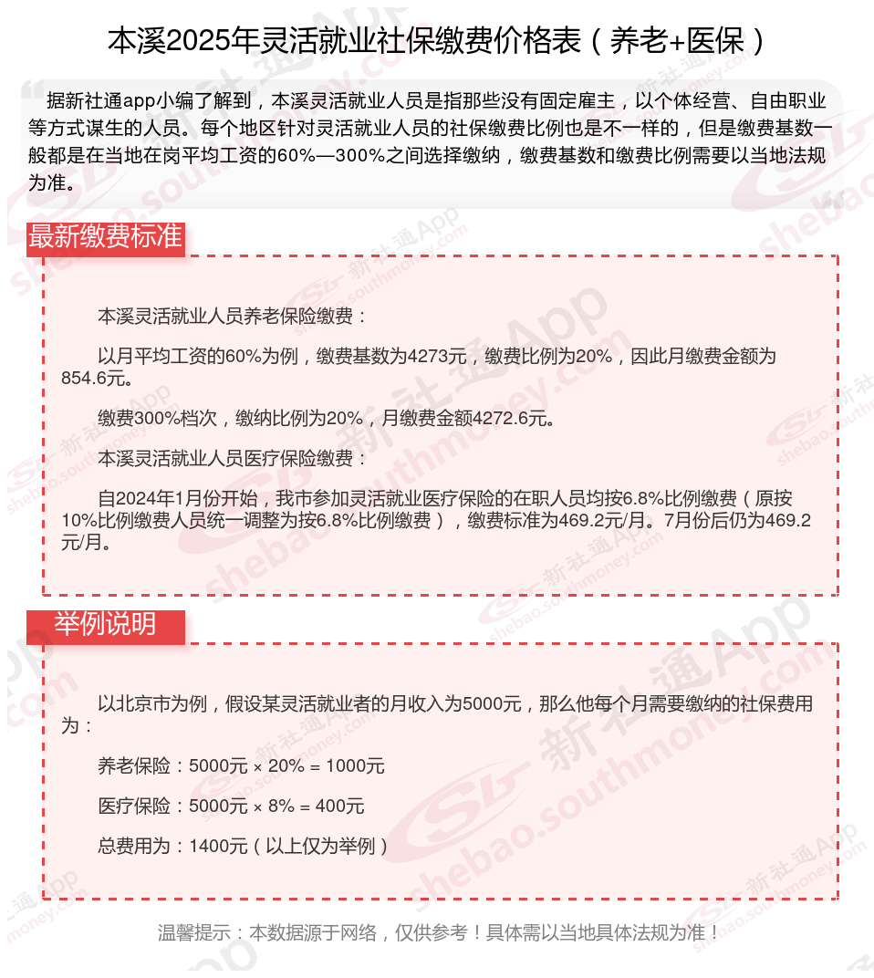据新社通app数据显示,2024-2025年本溪灵活就业人员养老保险的缴费标准: