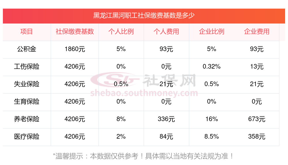 2025年黑龙江黑河职工社保缴费基数是多少钱一个月?职工社保缴纳标准是多少?