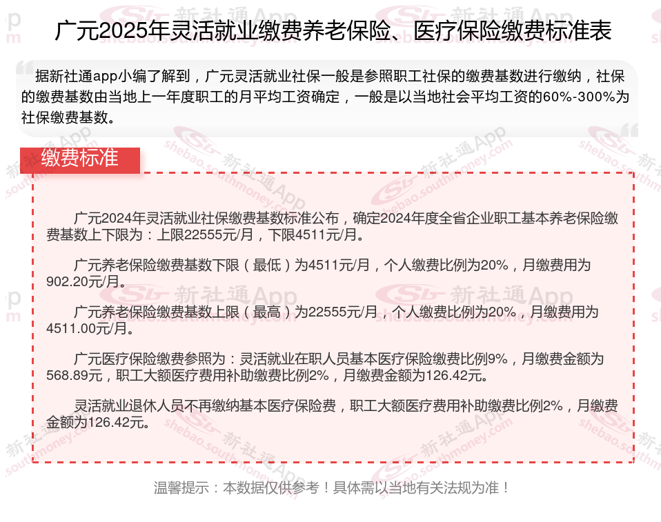 据新社通app数据显示,广元灵活就业人员养老缴费基数2024-2025年最新标准如下: