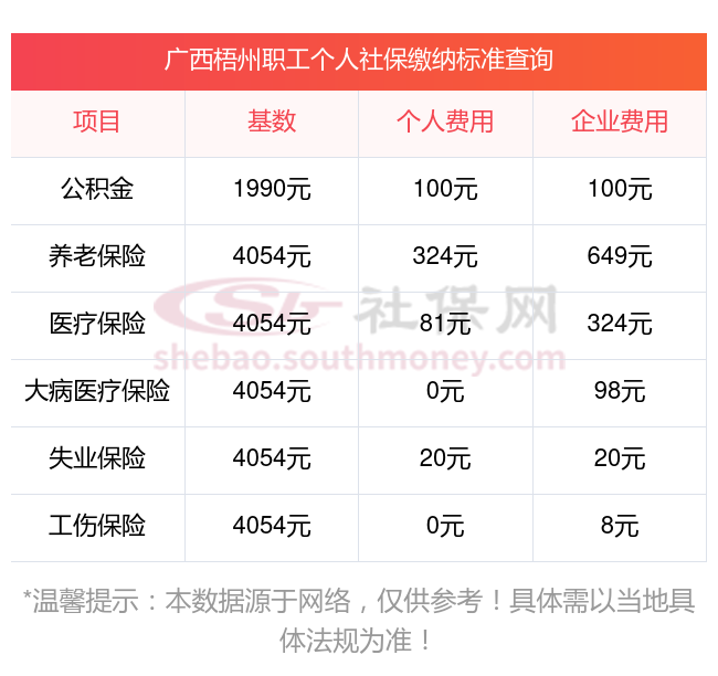 广西梧州缴费社保比例一览 社保公司和个人各交多少?下表是2024-2025年广西梧州社保费用明细参考,新社通app-社保缴费查询工具提供的最新数据如下: