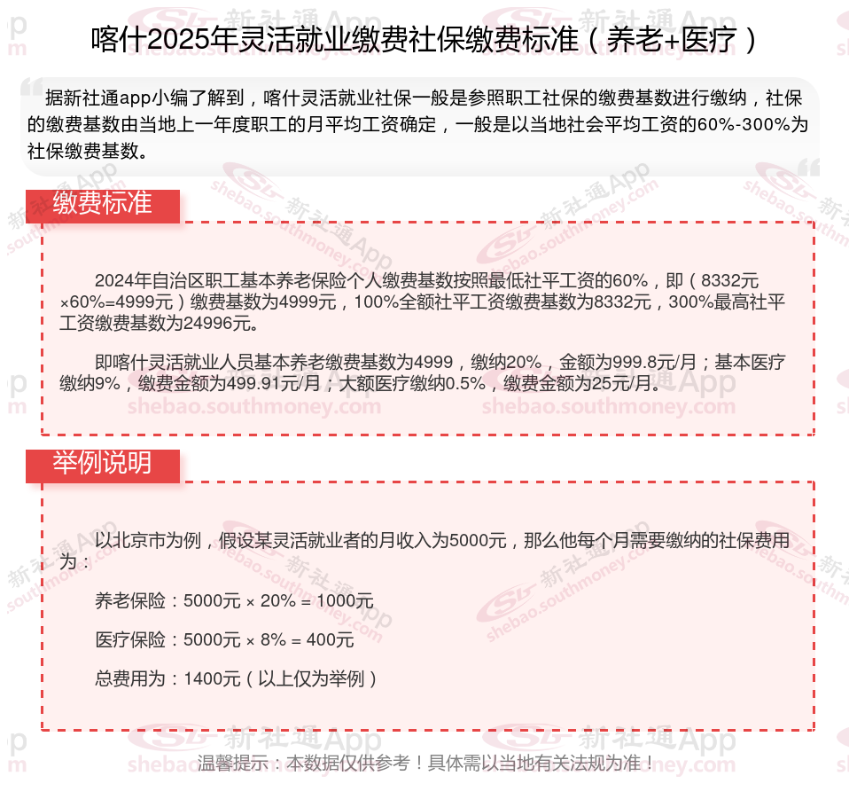 即喀什灵活就业人员基本养老缴费基数为4999,缴纳20%,金额为999.8元/月;基本医疗缴纳9%,缴费金额为499.91元/月;大额医疗缴纳0.5%,缴费金额为25元/月。