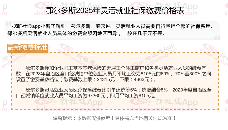 据新社通app数据显示,鄂尔多斯灵活就业人员养老保险缴费基数2024-2025年最新标准如下: