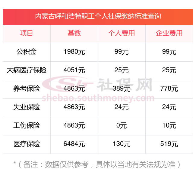 2025年社保多少钱一个月?下表是2024-2025年内蒙古呼和浩特社保费用明细参考,新社通app-社保缴费查询工具提供的最新数据如下: