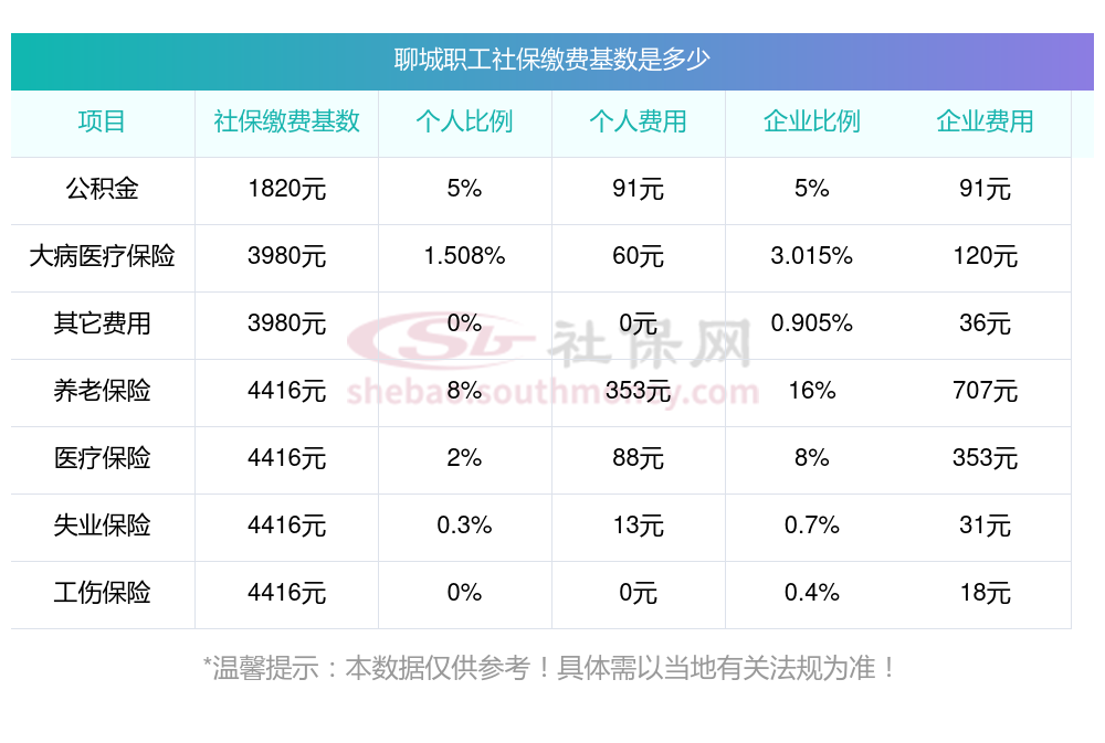 2025年聊城社保缴费多少钱?下表是2024-2025年聊城社保费用明细参考,新社通app-社保缴费查询工具提供的最新数据如下: