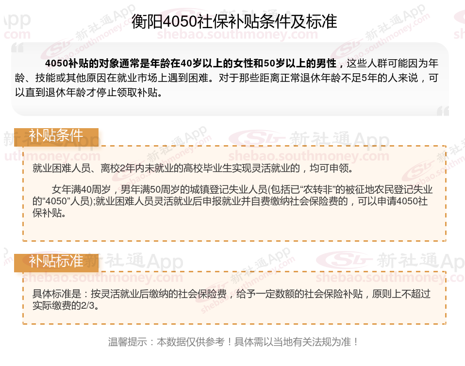 2025衡阳4050补贴主要针对的是年龄在40岁以上的女性和50岁以上的男性,这些人群通常因为年龄较大而面临就业困难。