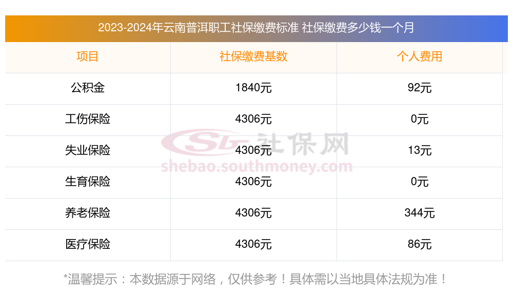 云南普洱缴费社保比例一览 社保公司和个人各交多少?下表是2024-2025年云南普洱社保费用明细参考,新社通app-社保缴费查询工具提供的最新数据如下: