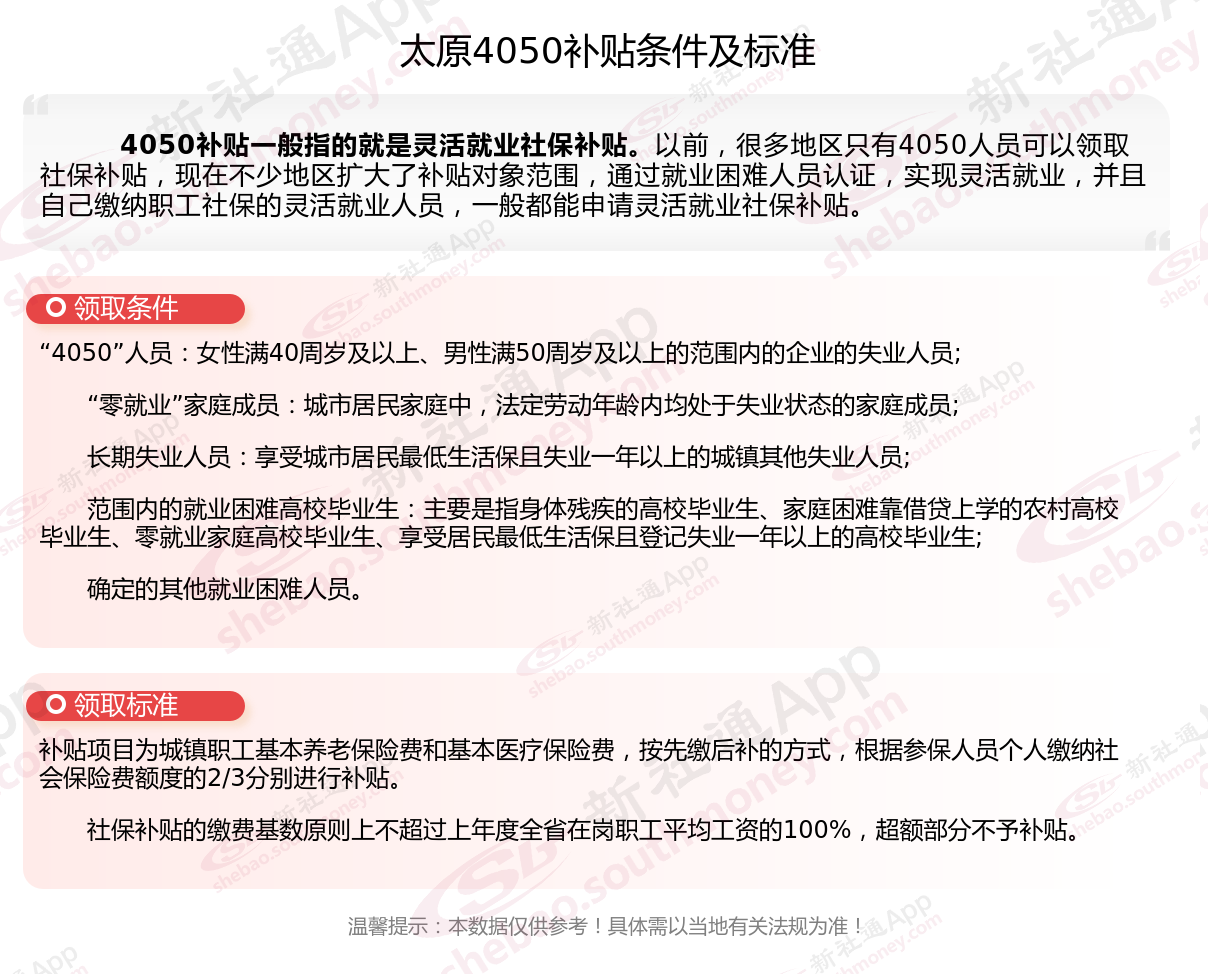 二、2025年太原4050社保补贴标准及条件,最新如下: