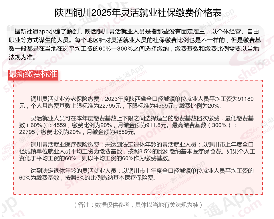 2024-2025年陕西铜川灵活就业人员社保缴费标准是多少?社保交完退休能领多少钱?下表是2024-2025年陕西铜川社保费用明细参考,根据新社通app-社保缴费查询工具提供的最新数据如下: