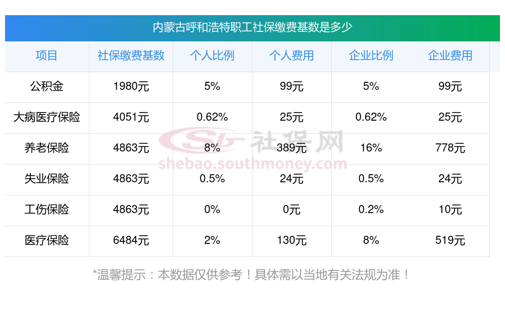 二、内蒙古呼和浩特职工社保缴费基数是多少钱一个月?职工社保缴纳标准